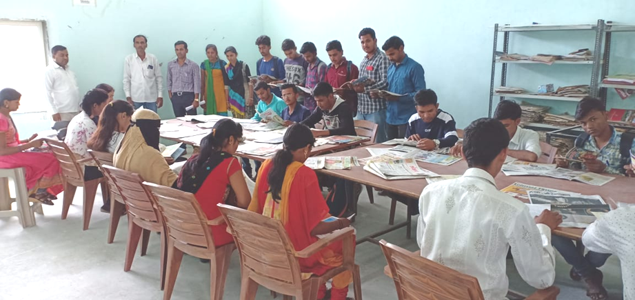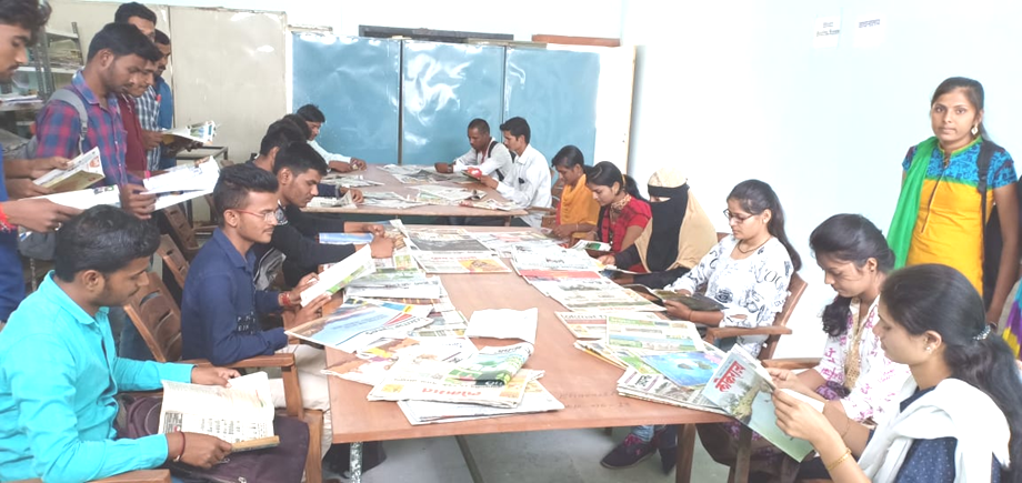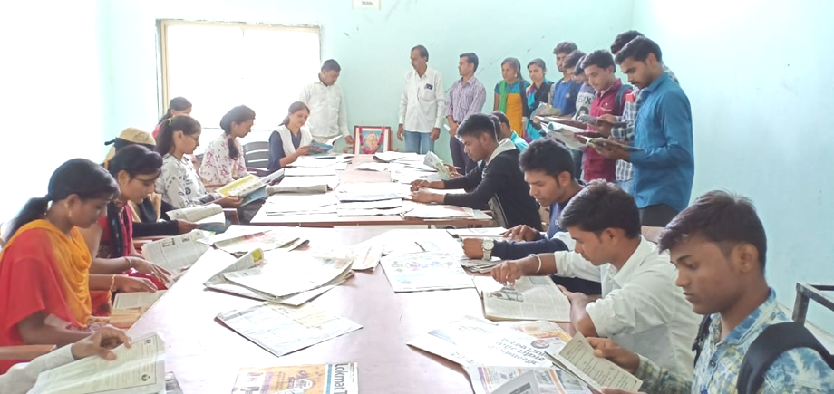 वाचन कक्षामध्ये वृत्तपत्र वाचताना विध्यार्थी